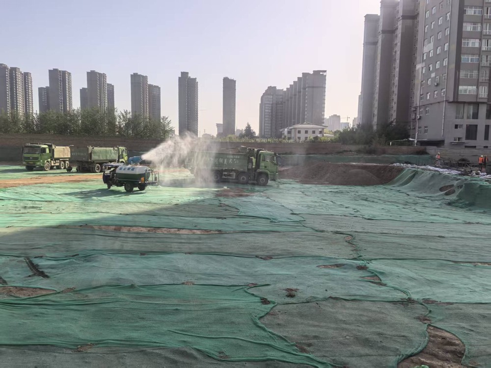 绿网覆土+喷淋联动,筑牢扬尘“第一道防线”。走进云谷市集项目施工现场,看不到裸露的黄土,取而代之的是一张张整齐铺设的绿色防尘网,如同为大地披上“绿衣裳”,从源头阻断扬尘产生。“我们对施工现场所有裸露土方、闲置场地实现100%全覆盖,安排专人每天巡查,及时修补破损绿网,确保防护不留死角。”项目现场负责人介绍。除了绿网覆盖这一基础举措,该项目部还创新打造“雾化降尘+机械清扫”组合拳,施工道路两侧安装智能喷淋系统,可根据粉尘浓度自动开启喷雾;2台雾炮机、1辆洒水车分时段作业,每天对施工区域、运输道路进行至少3次的全面清扫洒水,让空气湿度始终保持在合理范围,有效抑制扬尘扩散,让工地空气更清新,也为周边居民营造了舒适的生活环境。