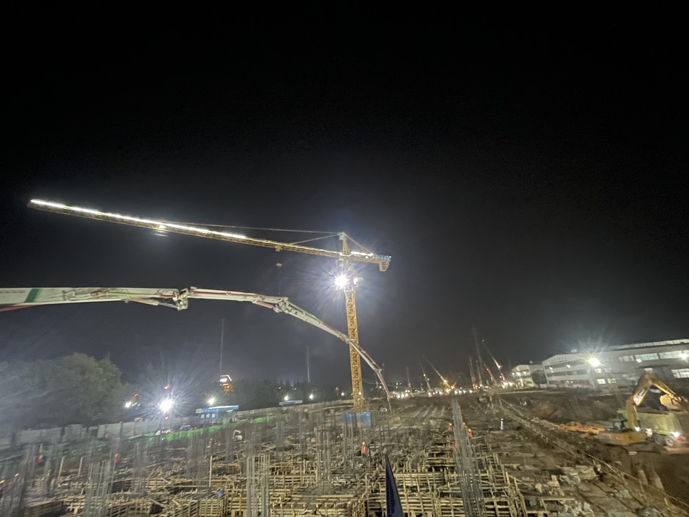 强化要素保障,为“进度条”满格赋能。决战四季度,资源保障是关键。该项目部通过科学统筹、精准调度,确保了人员、机械、材料等核心要素的充足与高效运转。一是优化人力资源配置。根据每日作业计划,精准投入人力资源。在104铜箔车间桩基工程集结了65名各类工种人员,大家分工明确,协同作业,以“白加黑”连轴转的干劲抢工期、赶进度;在主体结构施工作业面,更是投入了105人的庞大团队,钢筋工、木工、砼工等各专业队伍配合默契,形成了高效的流水作业。二是施工机械高效联动。在桩基工程区域,配备5台旋挖机、5台吊车、3台挖机等重型设备同时运转,轰鸣声震耳欲聋;在主体施工现场,配置2台63米天泵长臂伸展,为即将进行的大体积混凝土浇筑做好准备;在106动力站区域,铲车、拉土车、夯机等设备联合作业,确保土方工程快速推进。三是精准调配建材。根据施工节点倒排材料需求计划,将钢筋、模板、混凝土等关键建材足额储备、随到随用,杜绝因材料短缺而延误工期。精准的资源统筹与高效供给,为项目“决战四季度”筑牢了坚实后盾。